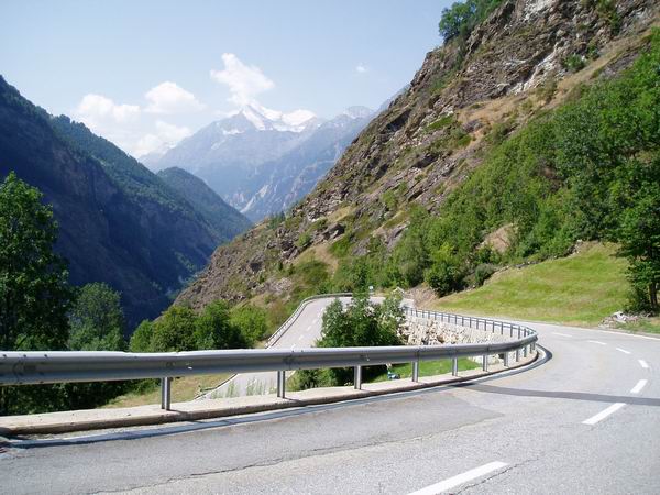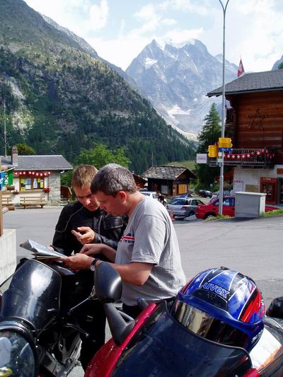 Gut gestärkt genossen wir die Kühle in 2000 m Höhe und hatten keine Eile, denn die heutige Wegstrecke war im Vergleich zu den vorangegangenen Tagen relativ kurz und wir mussten sowieso noch auf Johannes warten. Als er mit neuen Belägen eintraf (Simone Betteo vonKTM und Aprilia ITAN in VISP hat mir trotz Verständigungsschwierigkeiten super geholfen!), konnte es wieder weiter gehen. Über leckere Kurven führte die schmale Straße nach unten zurück ins Rhonetal. Das nächste Seitental stand schon auf dem Programm: in Grone fuhren wir ins Val d'Hérens, laut Denzel das schönste Seitental des Wallis. Über nette kleine Dörfer gelangten wir zum Talschluß nach Arolla. Dort war die Straße zu Ende und wir machten ein Päuschen, um bei einem café au lait (wir hatten die Sprachgrenze im Wallis passiert) die Aussicht auf die mächtigen Dreitausender zu genießen, die sich vor uns aufragten. Als wir wieder losfuhren, kam auch die Gruppe B an.