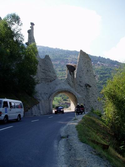 Die Abfahrt zum Rhonetal wartete mit einer besonderen Sehenswürdigkeit auf: steil aufragende Steinpyramiden bei Euseigne, durch die die Straße direkt hindurch führt. Sie wirken irgendwie unwirklich und von einer großen Hand dort hinmodelliert.